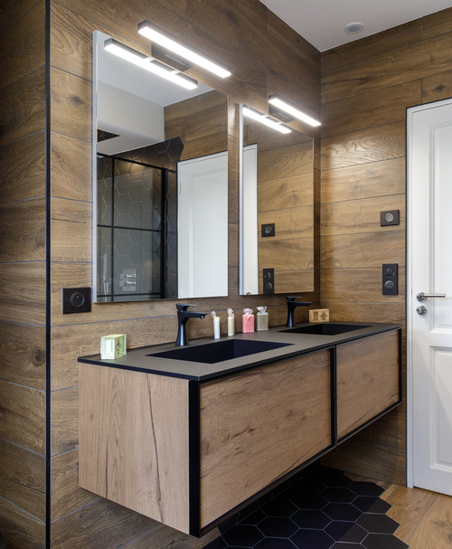 Dans la salle de bain, une fois le plan vasque et la douche et/ou la baignoire équipée en solutions d’éclairage, il faudra également construire une base lumineuse avec un minimum de spots avec des faisceaux larges pour couvrir un maximum de surface.