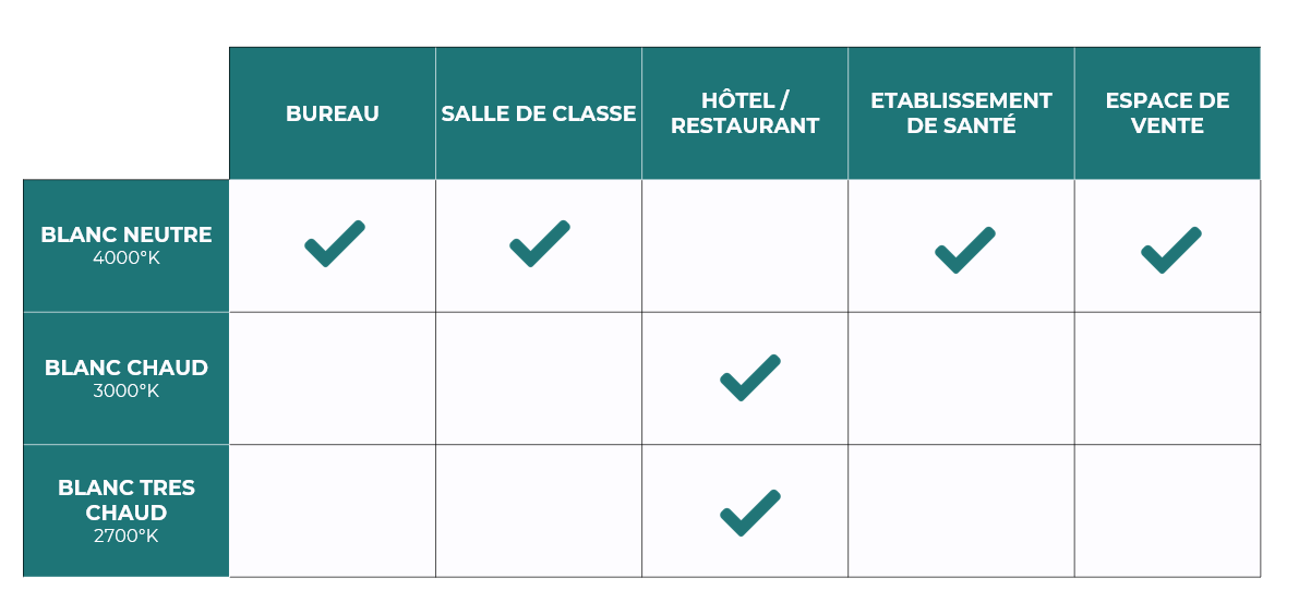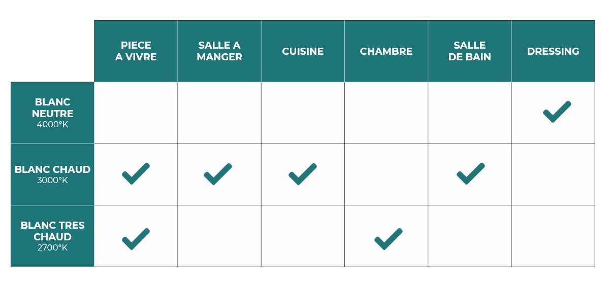 Si vous ne savez pas vers quelle couleur de température choisir, nous vous conseillons de vous référer à nos tableaux ci-dessous :