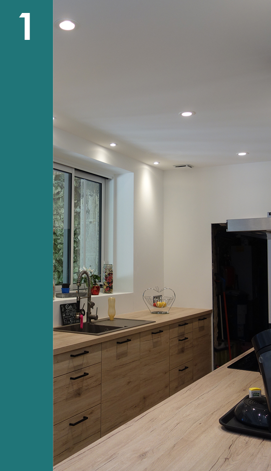 Si ce sont uniquement des armoires ou étagères de rangement haut, une base centrale de spots encastrés sera parfaite avec des luminaires de type COMPACT en 60° d'ouverture de faisceau, ou si votre plafond est plus haut des encastrés CITRON ou GRÈGE.