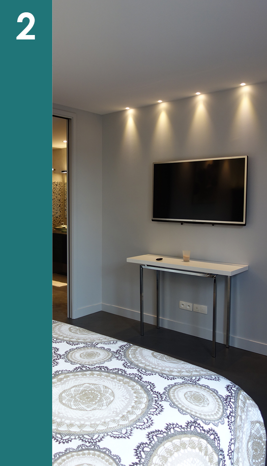 Pour un confort optimal, FD Eclairage vous conseille de conserver toujours la base lumineuse avec des encastrés basses luminances et de prévoir un second circuit avec un éclairage indirect en ras de mur sur le mur face au lit par exemple.