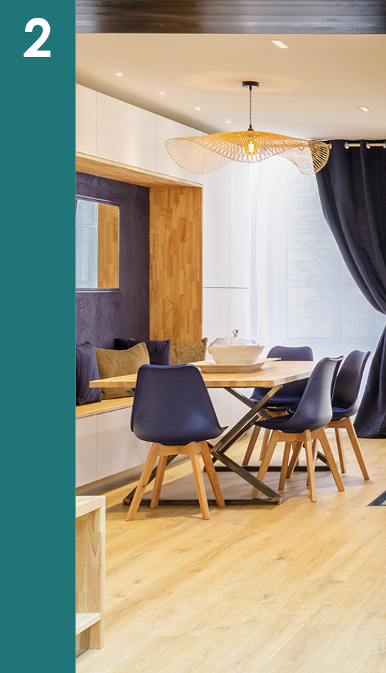 Pour créer une ambiance conviviale indispensable dans cette pièce, il faut réussir à mixer un éclairage décoratif, telle une suspension, avec un éclairage fonctionnel, tels des spots, pour apporter du confort et mettre toute la pièce en valeur.